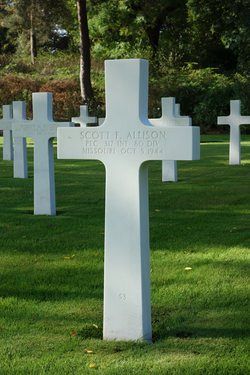 Pfc Scott F. Allison was an elevator operator in an office building at Walnut Reality Co.On 20 September 1944 he joined his unit from the 38th Replacement Battalion. On 26 September in the morning, H company attacked their objective, 1 mile south of Lyer, France, but hit stiff opposition and had to withdraw to reorganise.