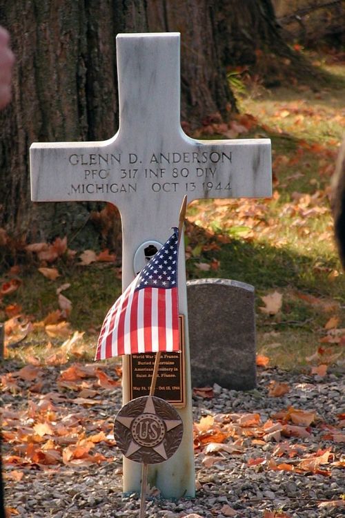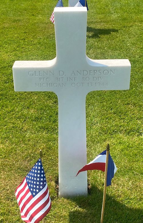 Pfc Glenn D. Anderson graduated from Gladwin High School in June of 1936 and worked at Gladwin Flouring Mills.He enlisted on 16 March 1944 and was was sent overseas on 1 September 1944.
