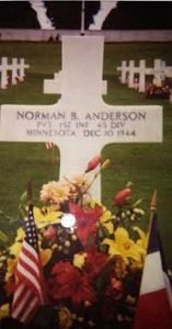 Pvt Norman B. Anderson was employed at the New Brighton Defense plant.He enlisted at Fort Snelling, Minnesota on 26 February 1944. He trained at Camp Wolters, Texas and Fort Meade, Maryland. He was in service only 17 weeks when he left the USA. Before going to France, he spent 6 weeks in England.
