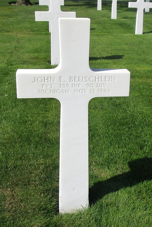 Pvt John E. Beuschlein enlisted in March 1943 and was sent overseas in May 1944.He was first buried at the Temporary American Military Cemetery in Limey, France.