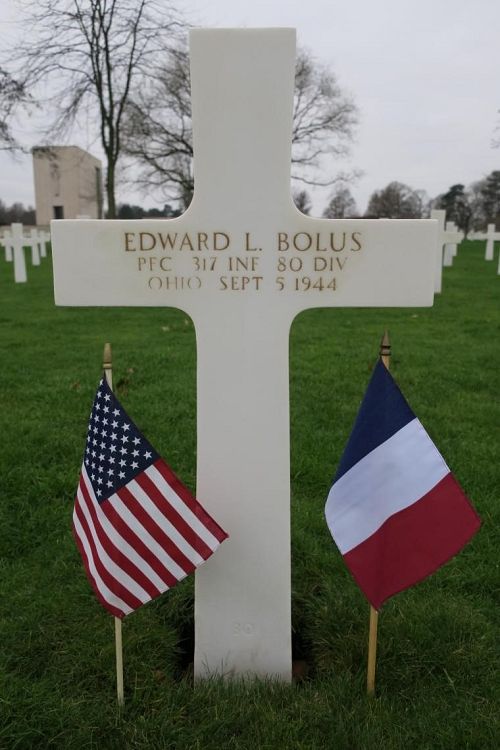 Pfc Edward L. Bolus attended high school for two years and worked in a laundry before he enlisted at Fort Thomas, Newport, Kentucky on 15 March 1943.Source of information: Leo Minne, Carla Mans, www.abmc.gov, www.wwiimemorial.com, www.ancestry.com - 1930/1940 Census / U.S. Headstone and Interment Record / Ohio Birth Index / U.S. WWII Draft Cards Young Men, www.80thDivision.com