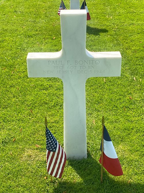 Pfc Paul F. Bonito enlisted in Newark. New Jersey on 19 December 1942.His tank destroyer was hit by an enemy shell. His close friend Martin Jackson went to help him but was restrained by two men as the vehicle exploded.