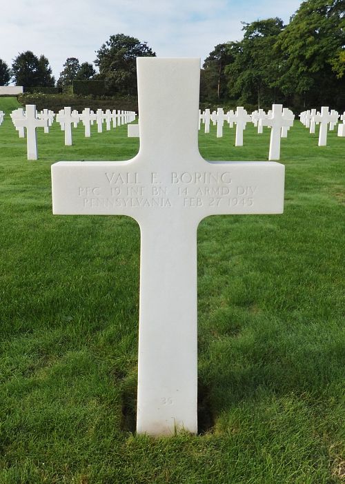 Pfc Vall E. Boring enlisted at Fort George G. Meade, Maryland on 29 March 1944.Source of information: Peter Schouteten, Kathy McDermott, www.abmc.gov, www.wwiimemorial.com, www.archives.gov – WWII Enlistment Record, www.ancestry.com - Headstone and Interment Record / 1940 Census / Pennsylvania Veteran Compensation Application Files WWII, www.findagrave.com, http://14thad.org