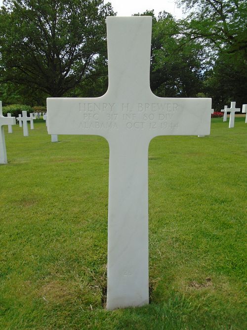Pfc Henry H. Brewer was an employer of Avondale Mills before he enlisted at Fort McClellan, Alabama on 30 July 1942.He was reported lightly wounded in action in Sivry, France on 5 October and brought to the 101th Evacuation Hospital where he died of his wounds.
