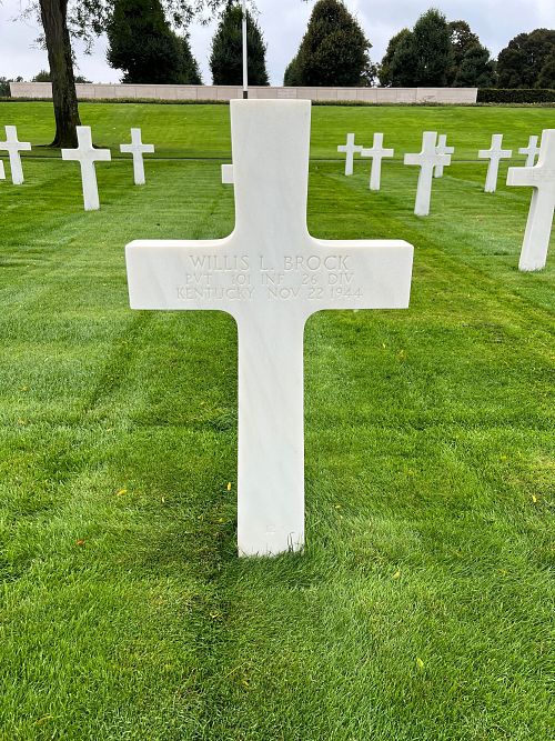 Pvt Willis L. Brock attended high school for two years before he enlisted at Fort Thomas Newport, Kentucky on 11 April 1944.He was killed by artillery shell fragments.
