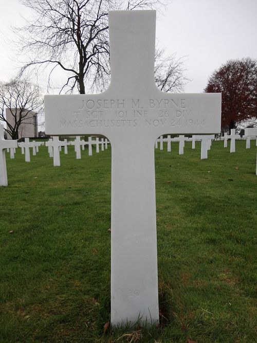 T/Sgt Joseph M. Byrne attended high school for one year and was a carpenter before he enlisted in Boston, Massachusetts on 18 March 1941. He was sent overseas in August 1944.He was killed by artillery shell fragments to his leg.