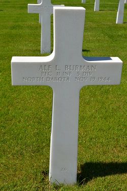Pfc Alf L. Burman was first buried at the Temporary American Military Cemetery Limey, France.His brother Alger died of wounds on 26 October 1944 in the southern Leyte Valley during the recapture of the Philippines.