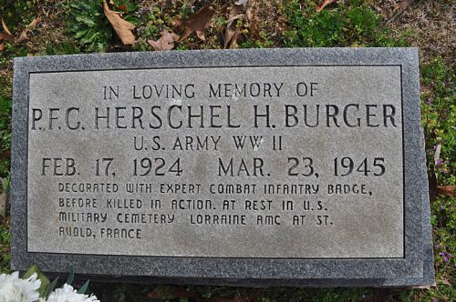 Pfc Herschel H. Burger attended high school for two years and worked on a farm before he enlisted at Fort McPherson Atlanta, Georgia on 19 August 1944.He is remembered at the Farmington Cemetery in Farmington, Oconee County, Georgia.
