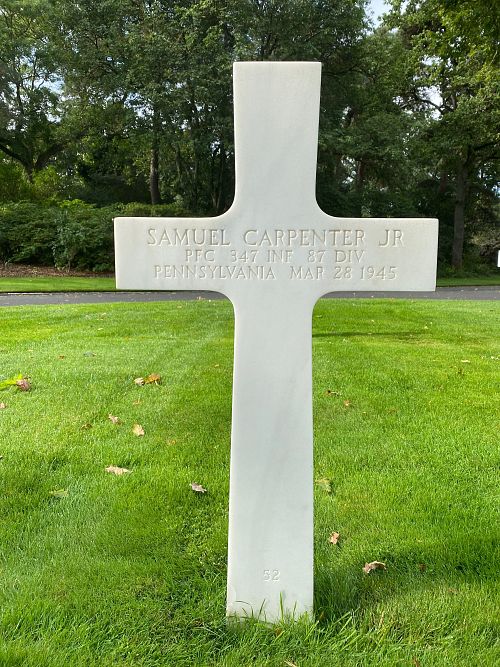 Pfc Samuel Carpenter Jr. was employed by the Republic Steel Corporation before he enlisted in Pittsburgh, Pennsylvania on 17 November 1943.Pfc Carpenter's nephew, Pvt. Charles W. Carter, was killed six days earlier. He is buried at Netherlands American Cemetery and Memorial in Margraten.