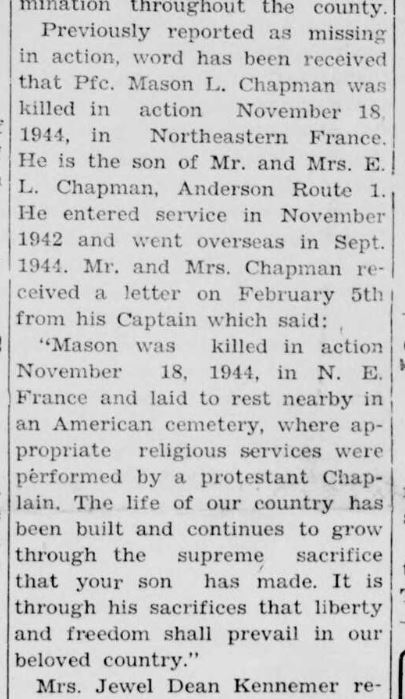 Pfc Mason L. Chapman attended high school for three years and worked on a farm before he enlisted at Fort McClellan, Alabama on 31 October 1942. He was sent overseas in September 1944.Documents