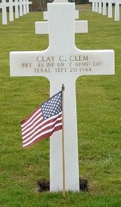 Pvt Clay C. Clem enlisted in Dallas, Texas on 19 May 1942.Source of information: André Koch, www.abmc.gov, www.wwiimemorial.com, www.archives.gov – WWII Enlistment Record, www.ancestry.com - 1920/1930/1940 Census / Headstone and Interment Records / U.S. WWII Draft Cards Young Men, 1940-1947, www.7tharmddiv.org