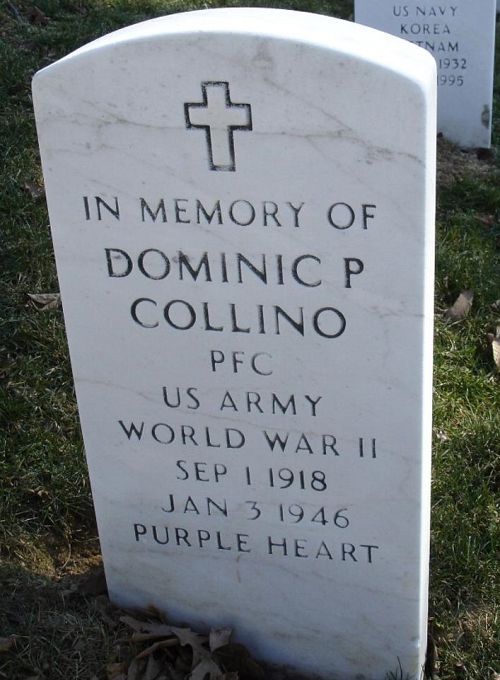 Pfc Dominic P. Collino attended high school for three years and was a barber before he enlisted at Fort Benjamin Harrison, Indiana on 26 April 1944.He was officially declared dead one year and one day after he was reported missing in action. At that time his unit was fighting in the vicinity of Bliesbruck, France.