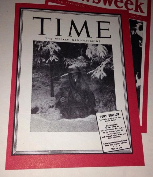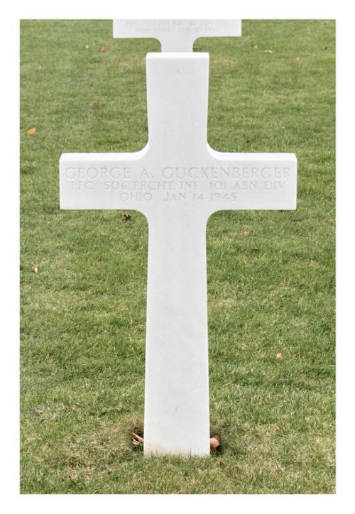 Pfc Guckenberger's iconic photo of him standing in Thomas Pease's foxhole made the cover of Time magazine on 12 January 1945. His life ended at that spot two days later.