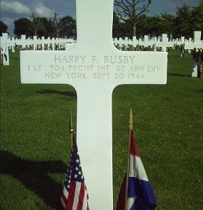 1st Lt Harry F. Busby enlisted in Jamaica, New York on 4 March 1941. Both his parents were born in the United Kingdom.Lt Busby had a premonition just moments before the Waal Crossing took place that he wasn't going to survive the action, and threw his cigarette lighter away...