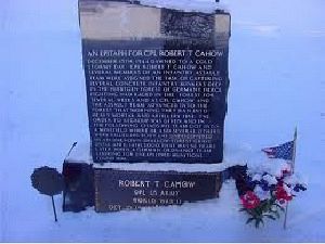 The units target was Schmidt and K Company was assigned to execute a diversionary assault on a bunker in the forest. Many of the soldiers in Company K were new to combat. Anti-personnel mines and enemy fire killed and wounded many. Several men volunteered to recover the wounded, Robert Cahow was one the volunteers, his friend Harvey Jorgensen was another. Jorgensen recalls: "We made our way slowly through the shattered undergrowth, snow falling steadily. We were spaced about 50-75 yards apart so as not to alert the Germans, who were all around in trenches and log emplacements. At once the silence was shattered by a detonation. Robert had hit a booby trap". The resulting fire from the alarmed Germans threw the survivors back. The confusion that followed meant that Jorgensen and his comrades couldn't locate Robert. Later the Germans found and buried him near the bunker that had been his units objective.
