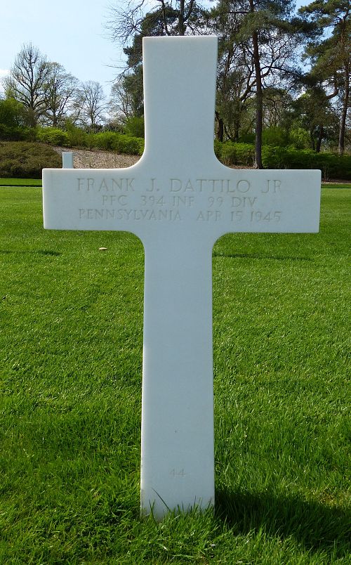 Pfc. Frank J. Dattilo Jr. went to Old Forge High School where he played football, attended 1 year of college and he was a metal products fabricator before he enlisted on 3 December 1942 in Wilkes Barre, Pennsylvania.He went overseas on 29 September 1944 and was taken a Prisoner of War on 18 December 1944 in the vicinity of Krinkelt, Belgium.