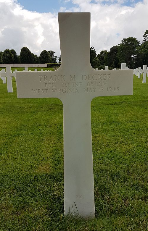 Pfc Frank M. Decker attended high school for three years.He enlisted at Fort Thomas, Newport, Kentucky on 13 March 1944.