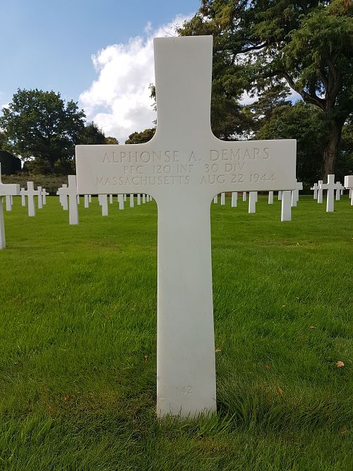 Pfc Alphonse A. Demars was a sales clerk before he enlisted at Fort Devens, Massachusetts on 12 November 1942.His brother, Pvt Norman E. Demars is buried next to him.