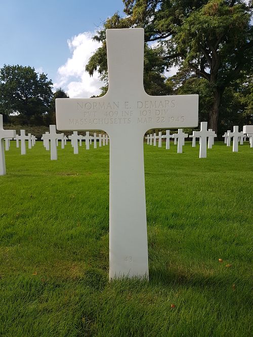Pvt Norman E. Demars enlisted at Ft Devens, Massachusetts on 4 November 1943.His brother, Pvt Alphonse A. Demars, is buried next to him.