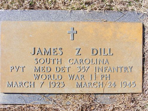 Pvt James Z. Dill enlisted at Fort Jackson Columbia, South Carolina on 31 March 1943.He is remembered at the New Liberty Baptist Church Cemetery, Travelers Rest, Greenville County, South Carolina.