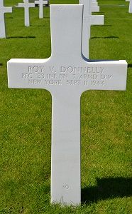 Pfc Roy V. Donnelly enlisted at Fort Dix, New Jersey on 13 March 1942.He was awarded the Silver Star Medal posthumously. The citation cited: for conspicuous gallantry and intrepidity in action against the enemy while serving as a Medical Aidman with the 23rd Armored Infantry Division, 7th Armored Division, in action in France, on 24 August 1944. Pfc Donnelly's gallant actions and dedicated devotion to duty, without regard for his own life, were in keeping with the highest traditions of military service and reflect great credit upon himself, his unit, and the United States Army.