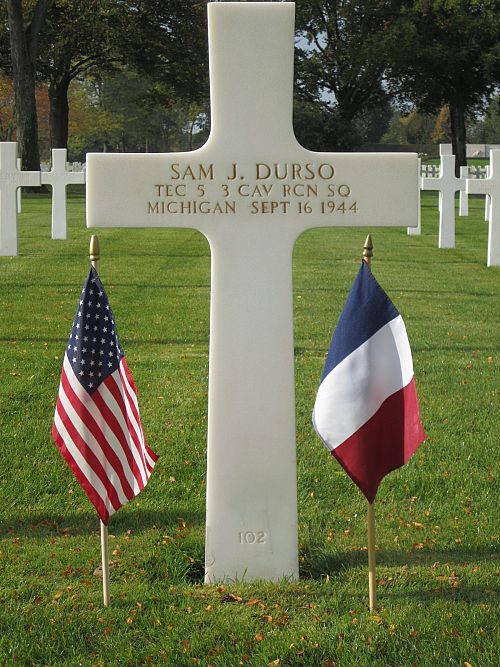 T/5 Sam J. Durso was employed at the Eastern Market before he enlisted.He was first buried at the Temporary American Military Cemetery in Andilly, France.