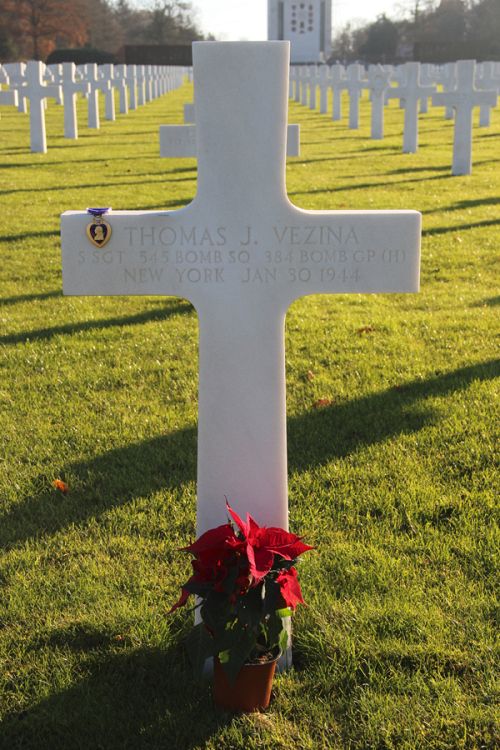 The tailgunner, S/Sgt Robert A. Grimes, stated that he saw S/Sgt Vezina just before the airplane exploded. He was hit and bleeding very badly. He was lying in front of the waist door.