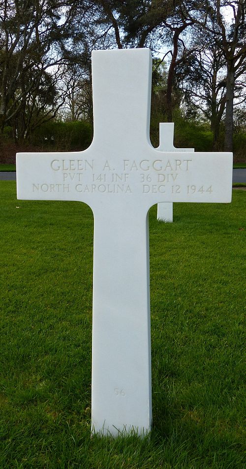 Pvt Gleen A. Faggart enlisted at Camp Croft, South Carolina on 22 November 1942. He trained at Fort Jackson, South Carolina, Fort Bragg, North Carolina, and Fort Meade, Maryland.He is remembered at the Cross of Christ Lutheran Church Cemetery in Concord, North Carolina.