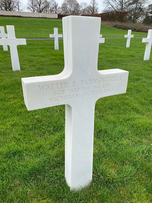 Sgt Walter J. Farnsworth attended high school for 2 years and was a driver before he enlisted in Kalamazoo, Michigan on 1 April 1943.He was first buried at the Temporary American Military Cemetery in Limey, France.