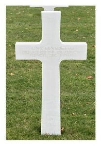 The day, they arrived to defend the perimeter around Bastogne, their objective was to reach Neffe and take defensive positions. Just before they enterred the village, two jeeps were send ahead to scout the area. When they turned a corner, they were fired upon by machineguns. Pfc Benedetto was the front passenger of the first jeep and responsable for the radio that he was wearing on his back.