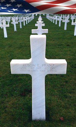 Cpl Alton E. Franz worked for a WPA project before he enlisted in Denver, Colorado on 7 March 1944.He was wounded in action and evacuated to a hospital on 25 November. At that moment his unit was engaged in a fighting in the vicinity of Faulquemont, France.