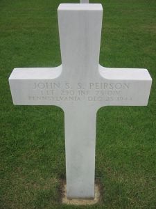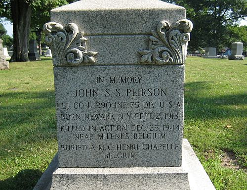 It took three frontal attacks on La Roumiere to win the hill from the Germans -- one on Christmas Eve, and two more on Christmas morning. By the time the 75th watched Hogan's men tramp safely through their positions late on Christmas Day, the 75th had lost more than 250 officers and men, my Dad among them. Many more were wounded, including my Mom, who got The Telegram a few days later in Pittsburgh, when I was four months old. Dad was buried with his buddies and still remains at Henri-Chapelle, in Belgium.Lieutenant Peirson was killed in action while leading his platoon on the north side of the Belgian Bulge.