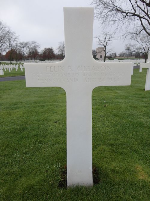 Sgt Felix B. Gleason joined the Air Corps of the U.S. Army Reserve in Erie, Pennsylvania, on 20 August 1943.On the way home, the airplane was attacked by Uffz. Willi Reschke of I./JG 302. Sixty years later, Mr. Reschke wrote: “I selected a B-24 and closed in on it from the rear with a clear height advantage. I opened fire, primarily aiming to disable the tail gunner, streaming his bursts towards me. My second burst hit the inboard port engine, which immediately started to burn. At that moment, my engine had been hit by several rounds, so I had to break my attack.” The bomber was then finished by Fw. Hubert Engst of II.(Sturm)/JG 300.