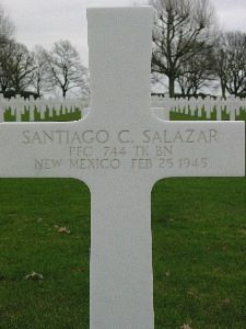 Pfc Santiago C. Salazar was a farmer beofre he enlisted in Sante Fe, New Mexico on 2 July 1942.Source of information: Peter Schouteten, Astrid van Erp, www.wwiimemorial.com, www.archives.gov, http://www.awon.org/fathers2.html, http://cgsc.contentdm.oclc.org - After Action Report 744 Tank Battalion, www.ancestry.com - New Mexico, World War II Record