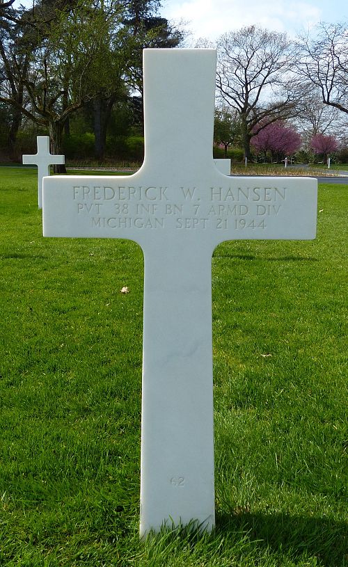 Pvt Frederick W. Hansen was married to Frances Olivia Brown on 7 November 1936.Source of information: André Koch, www.abmc.gov, www.wwiimemorial.com, www.ancestry.com - 1910/1920/1930/1940 Census / Headstone and Interment Records / U.S. WWII Draft Cards Young Men, 1940-1947 / Michigan, Marriage Records, 1867-1952, https://www.7tharmddiv.org