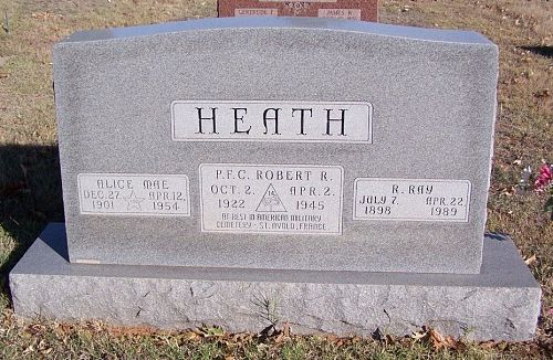 Pfc Robert R. Heath Jr. attended college for two years before he joined the Regular Army in Stillwater, Oklahoma on 7 December 1942.He is remembered at the Fairlawn Cemetery in Stillwater, Payne County, Oklahoma.