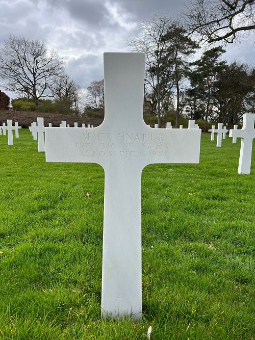 Pvt Mack Hnatiuk was employed at the Chicago Steel and Wire Company before he enlisted.Source of information: Peter Schouteten, www.abmc.gov, www.wwiimemorial.com, www.ancestry.com - Headstone and Interment Record / U.S. WWII Draft Cards Young Men / U.S. Social Security Applications and Claims Index, http://87thinfantrydivision.com