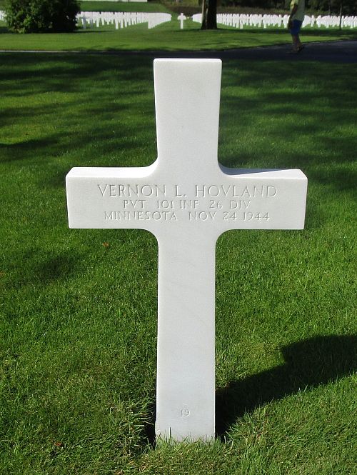 Pvt Vernon L. Hovland attended high school for four years before he enlisted at Fort Snelling, Minnesota on 6 May 1944.He was killed by artillery shell fragments in his neck and back.