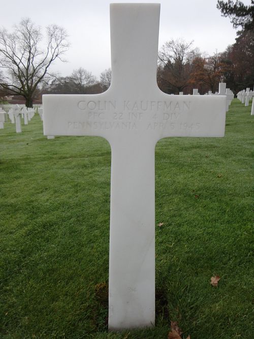 Pfc Colin Kauffman attended high school for 4 years and was a salesman before he enlisted in Philadelphia, Pennsylvania on 1 December 1943.Source of information: Peter Schouteten, Danny van der Groen - Company's / 4ID After Action Reports, www.abmc.gov, www.wwiimemorial.com, www.archives.gov - WWII Enlistment Record, www.ancestry.com - Headstone and Interment Record / Pennsylvania Veteran Compensation Application Files WWII