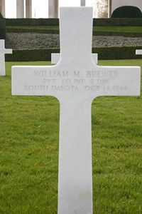 Pvt William M. Brewer enlisted at Fort Leavenworth, Kansas on 11 November 1943. He was trained at Camp Blanding, Florida and was sent overseas in July of 1944.He was wounded by shrapnel in the head on 13 October and died in a field hospital in Belgium a day later. At that time his unit was fighting in the vicinity of Germeter-Vossenack.