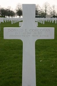 Donald Corcoran was killed by fragments of a mortar shell which landed near him.Source of information: Peter Schouteten, Terry Hirsch, www.wwiimemorial.com, www.archives.gov, http://www.in-honored-glory.info/, www.ancestry.com - U.S. Headstone and Interment Record / Smith Zappone, http://112th-infantry.blogspot.nl/2012/02/november-1944.html