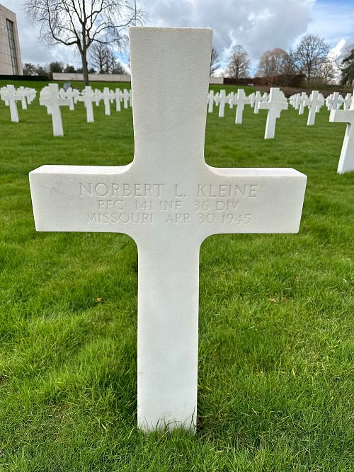 Pfc Norbert L. Kleine was a bank clerk before he enlisted at Jefferson Barracks, Missouri on 26 April 1944.Source of information: André Koch, www.abmc.gov, www.wwiimemorial.com, www.archives.gov – WWII Enlistment Record, www.ancestry.com - 1910/1920/1940 Census / Headstone and Interment Records / U.S. WWII Draft Cards Young Men, https://36th-id.frb.io/, 141aar-December-1944-to-end.pdf