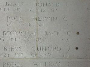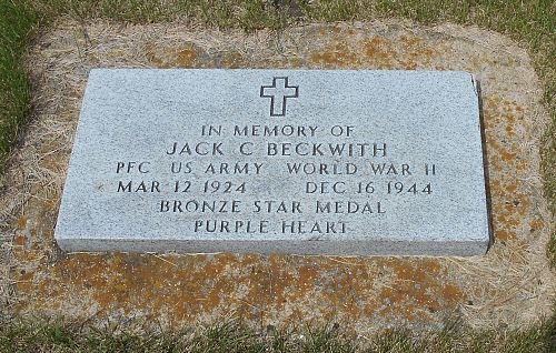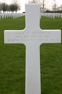 Jack Beckwith used the surname Ohnstad until he enlisted. He sang in the church choir and played guard on his high school football team. He wanted to become a minister and spent a semester at Jamestown College.On 15 December 1944 elements of the 99th Infantry Division were dugg in on Hill 627 near the German border. When orders were given to retreat, casualties were quickly buried in four shallow temporary graves.