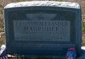 Pfc Lee A. Magruder attended high school for four years before he enlisted in Evansville, Indiana on 6 July 1943. He had been overseas September 1944.He was first buried at the Temporary American Military Cemetery in Limey, France.