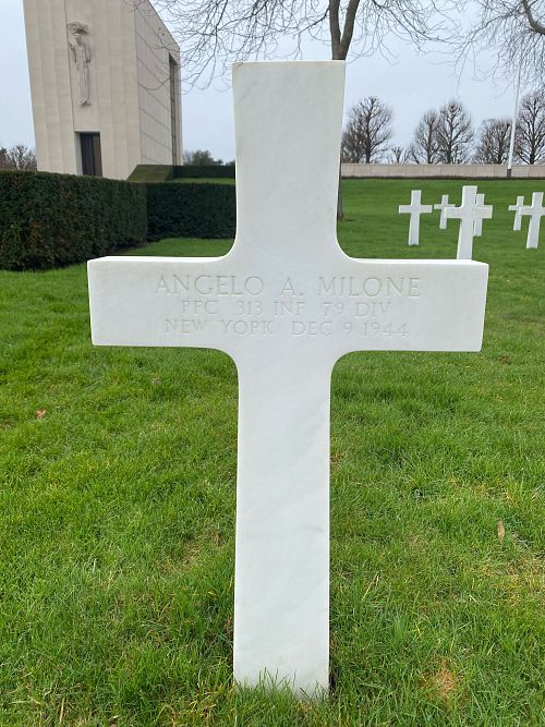 Pfc Angelo A. Milone attended high school for four years and was a driver before he enlisted in New York City before he enlisted in New York City, New York on 15 July 1943.He was killed by small arms fire in his hemorrhage.