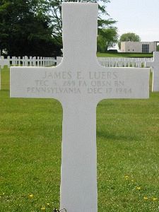 T/5 James E. Luers attended Oliver High School and Allegheny Vocational School and worked for Crucible Steel Co. before he enlisted in 1942. He was overseas for four and a half months.He was one of the victims of the Malmedy massacre when German SS soldiers of the 1st Panzer Division captured over 100 American soldiers at Baugnez Crossroads outside Malmedy, Belgium, on 17 December 1944 during the Battle of the Bulge and, under orders to take no prisoners, placed them in an open field and then machine gunned them. When the machine guns stopped, the SS went through the field where some victims were still alive and systematically finished them off with pistols at short range, leaving 84 soldiers dead when they had finished. Fortunately, when the machine guns first started shooting, a number of soldiers ran, and some managed to escape and tell the story of how the Germans had treated the others who had not survived.