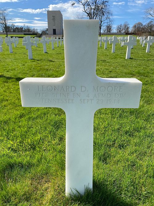 Pfc Leonard D. Moore enlisted at Fort Oglethorpe, Georgia on 3 July 1943.Source of information: André Koch, www.abmc.gov, www.wwiimemorial.com, www.archives.gov – WWII Enlistment Record, www.ancestry.com - 1930/1940 Census / Rowland Family Tree / Headstone and Interment Record / Kentucky, Birth Index, 1911-1999, AAR 51st AIB August 1944 thru May 1945