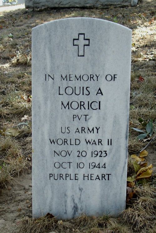 Pvt Louis A. Morici attended high school for two years and was employed at the Lab Furniture Company before he enlisted in New York City, New York on 8 February 1943.On the night of 10 October 1944, Company B suffered the loss of 47 men in an explosion of anti-tank mines at Ajoncourt, France. The third and elements of the first platoon were engaged in a night mine laying operation just north of the town. The squad trucks loaded with mines were parked at a point just south of the town and the mines were being fused and unloaded from the trucks and carried to the mine field. At approximately 2300, a terrific explosion from the leading truck which was loaded with mines caused a sympathetic detonation of a nearby truck load of mines and mines stacked on the ground nearby. Approximately 1,500 mines in all exploded. The entire area immediately became an inferno of exploding mines, small arms ammunition and burning vehicles.