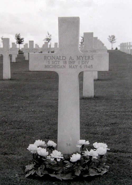 S/Sgt Ronald A. Myers attended 4 years of college and was formerly a conservation officer before he volunteered for the Army of the United States in Detroit, Michigan on 9 December 1942.Source of information: Peter Schouteten, www.abmc.gov, www.wwiimemorial.com – David J. Myers, www.archives.gov – WWII Enlistment Record, www.ancestry.com - Headstone and Interment Records / Ackerson Eckerson Family Tree / Michigan Marriage Records, www.newspapers.com – The Herald Press Michigan 22 May 1945, http://bigdaddydavesbitsandpieces.blogspot.com/2010/08/ronald-allen-myers.html