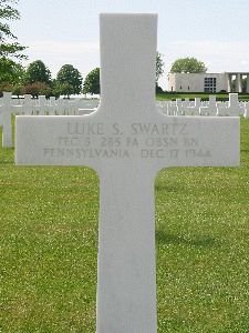 T/5 Luke S. Swartz enlisted on 20 January 1943 and trained at Camp Gruber and Fort Sill, Oklahoma. He was sent overseas in August 1944.He was one of the victims of Malmedy massacre when German SS soldiers of the 1st Panzer Division captured over 100 American soldiers at Baugnez Crossroads outside Malmedy, Belgium, on 17 December 1944 during the Battle of the Bulge and, under orders to take no prisoners, placed them in an open field and then machine gunned them. When the machine guns stopped, the SS went through the field where some victims were still alive and systematically finished them off with pistols at short range leaving 84 soldiers dead when they had finished. Fortunately, when the machine guns first started shooting, a number of soldiers ran and some managed to escape and tell the story of how the Germans had treated the others who had not survived.